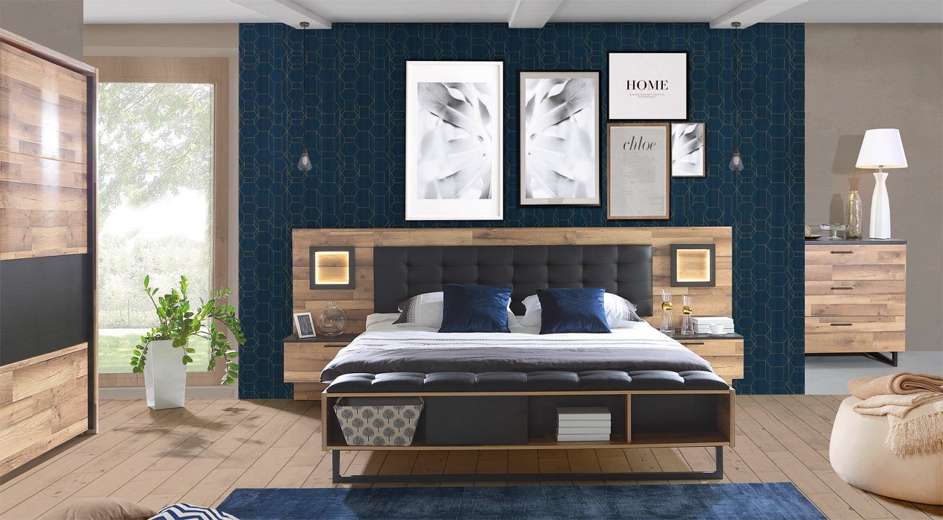 Masz ochotę na chwilę skryć się przed światem? Nic prostszego! – zamknij za sobą drzwi sypialni. Stylowe meble Jakobina sprawią, że słowo relaks nabiera zupełnie nowego znaczenia i przenosi nas do dotychczas nieznanego wymiaru odpoczynku. Klasyczne, dębowe dekory tworzą idealny związek z czarną tapicerką zachęcając do wytchnienia po całym dniu obowiązków i pośpiechu. Z tą kolekcją stworzysz swoją własną, prywatną oazę spokoju, w której zarówno lektura dobrej książki, jak i podana do łóżka poranna kawa czy głęboki, spokojny sen, za każdym razem będą smakować wyśmienicie. Przestrzeń wokół z łatwością uporządkuje pojemna komoda na stylowych nóżkach oraz szeroka szafa przesuwna z oświetleniem, która z powodzeniem zastąpi oddzielną garderobę.