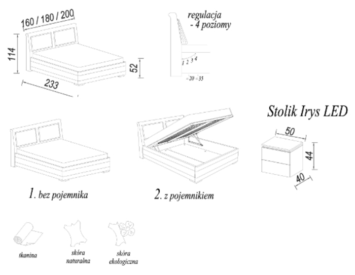 Irys Relax to stylowe, niezwykle funkcjonalne łóżko tapicerowane. Nowoczesne i funkcjonalne dzięki zastosowaniu regulowanego zagłówka oraz pojemnika na pościel. Irys Relax idealnie dopasuje się do sypialni o nowoczesnym wystroju. Mebel wykonany bardzo starannie z najwyższej jakości materiałów.