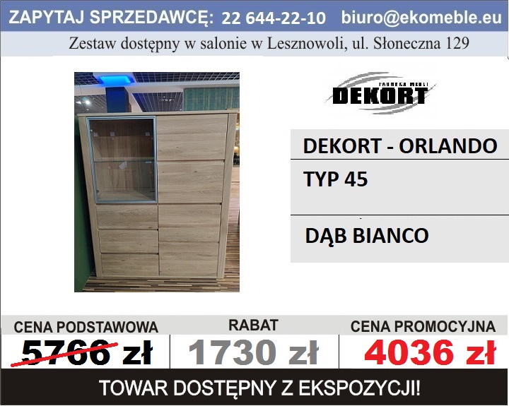 DEKORT - ORLANDO - TYP 45 - BIANCO Serdecznie zapraszamy do zapoznania się z ofertą mebli dostępnych z ekspozycji salonu przy ul. Słonecznej 129 - Lesznowola. Godziny otwarcia salonu: Dojazd z Ursynowa autobusem 737 Więcej informacji pod numerem tel. 22 644 22 10 Cechy produktu |