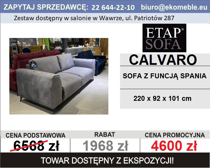 ETAP SOFA - CALVARO SOFA Z FUN. SPANIA, TK, MONOLITH PROMOCJA - KOMPLETY WYPOCZYNKOWE Sklep Ekomeble.com.pl posiada w swojej ofercie szeroki wybór kompletów wypoczynowych,który pozwoli urzadzić każde pomieszczenie w Twoim domu. Sprawdź meble w najlepszych cenach, jakie oferujemy Ci w naszym sklepie. Znajdziesz u nas wypoczynki, które z powodzeniem dopasujesz do swojego pomieszczenia. Nasze meble idealnie sprawdzą się jako element dekoracji wnętrza oraz miejsce wypoczynku. Cechy produktu