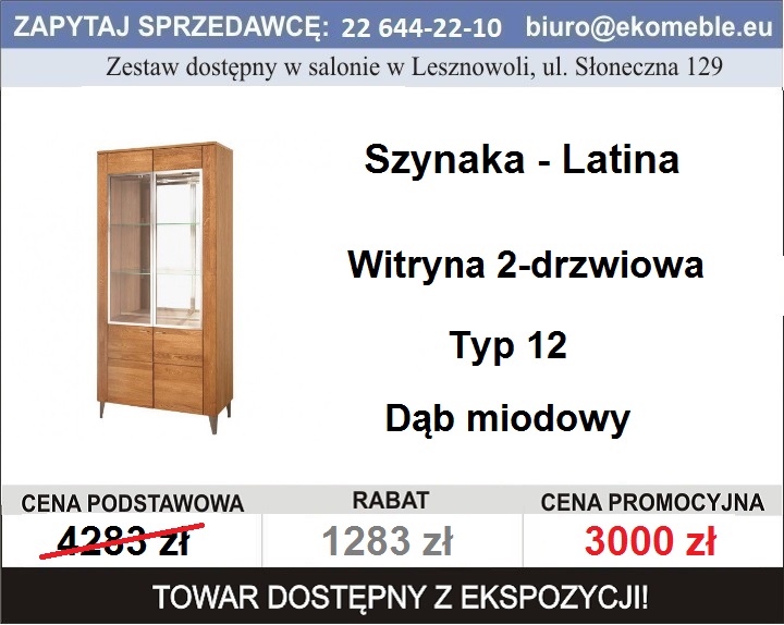 Szynaka Meble - Latina Typ 12 Witryna 2-drzwiowa Serdecznie zapraszamy do zapoznania się z ofertą mebli dostępnych z ekspozycji salonu przy ul. Słonecznej 129 - Lesznowola. Godziny otwarcia salonu: Dojazd z Ursynowa autobusem 737 Więcej informacji pod numerem tel. 22 644 22 10 Cechy produktu