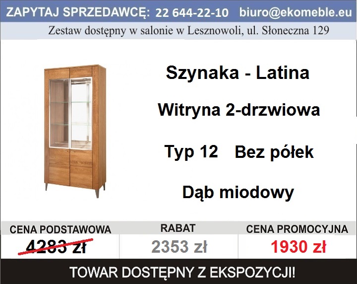 Szynaka Meble - Latina Typ 12 Witryna 2-drzwiowa Bez Półek Serdecznie zapraszamy do zapoznania się z ofertą mebli dostępnych z ekspozycji salonu przy ul. Słonecznej 129 - Lesznowola. Godziny otwarcia salonu: Dojazd z Ursynowa autobusem 737 Więcej informacji pod numerem tel. 22 644 22 10 Cechy produktu