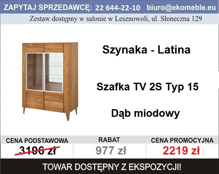 Szynaka Meble - Latina Typ 15 Szafka TV 2S Serdecznie zapraszamy do zapoznania się z ofertą mebli dostępnych z ekspozycji salonu przy ul. Słonecznej 129 - Lesznowola. Godziny otwarcia salonu: Dojazd z Ursynowa autobusem 737 Więcej informacji pod numerem tel. 22 644 22 10 Cechy produktu