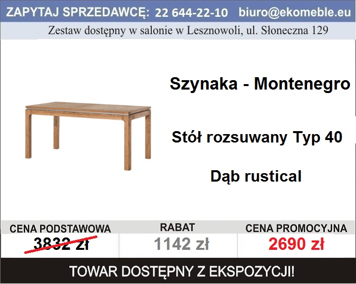 Szynaka Meble - Montenegro Typ 40 Stół rozsuwany Serdecznie zapraszamy do zapoznania się z ofertą mebli dostępnych z ekspozycji salonu przy ul. Słonecznej 129 - Lesznowola. Godziny otwarcia salonu: Dojazd z Ursynowa autobusem 737 Więcej informacji pod numerem tel. 22 644 22 10 Cechy produktu