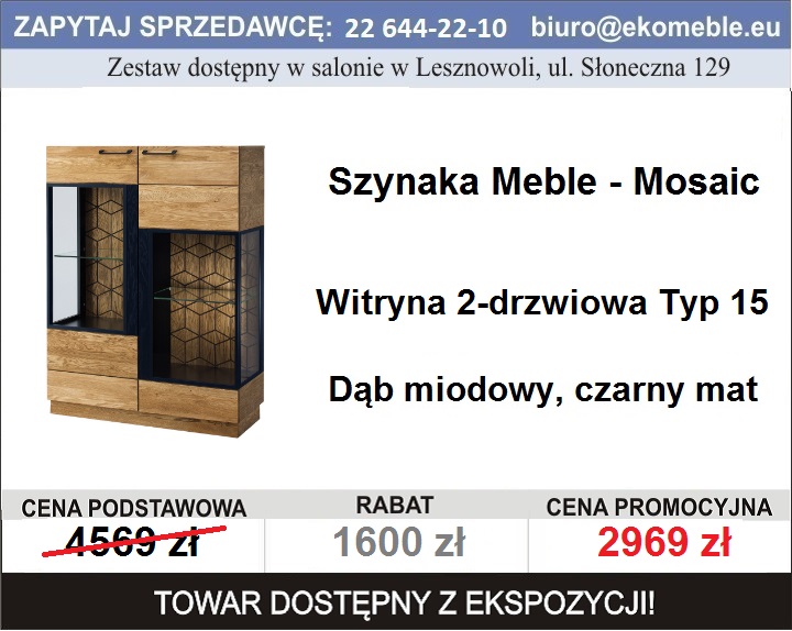 Szynaka Meble - Mosaic Typ 15 Witryna 2-drzwiowa Serdecznie zapraszamy do zapoznania się z ofertą mebli dostępnych z ekspozycji salonu przy ul. Słonecznej 129 - Lesznowola. Godziny otwarcia salonu: Dojazd z Ursynowa autobusem 737 Więcej informacji pod numerem tel. 22 644 22 10 Cechy produktu