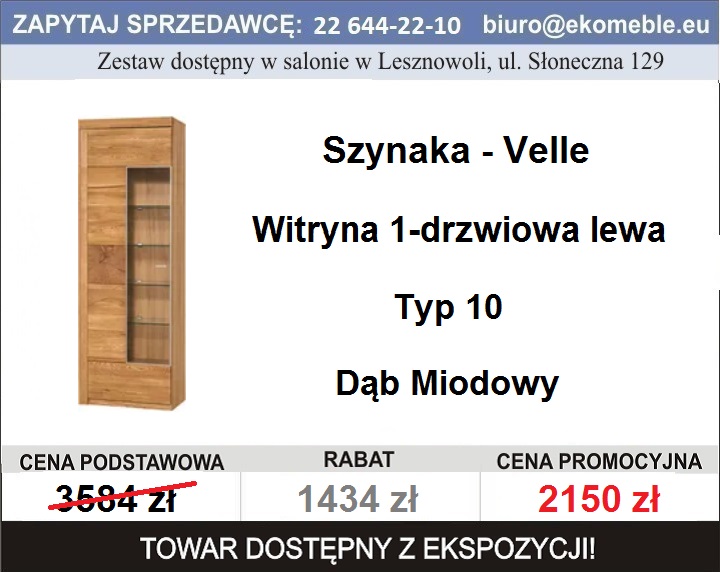 Szynaka Meble - Velle Typ 10 Witryna 1-drzwiowa lewa Serdecznie zapraszamy do zapoznania się z ofertą mebli dostępnych z ekspozycji salonu przy ul. Słonecznej 129 - Lesznowola. Godziny otwarcia salonu: Dojazd z Ursynowa autobusem 737 Więcej informacji pod numerem tel. 22 644 22 10 Cechy produktu