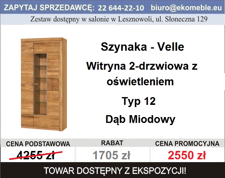 Szynaka Meble - Velle Typ 12 Witryna 2-drzwiowa z oświetleniem Serdecznie zapraszamy do zapoznania się z ofertą mebli dostępnych z ekspozycji salonu przy ul. Słonecznej 129 - Lesznowola. Godziny otwarcia salonu: Dojazd z Ursynowa autobusem 737 Więcej informacji pod numerem tel. 22 644 22 10 Cechy produktu