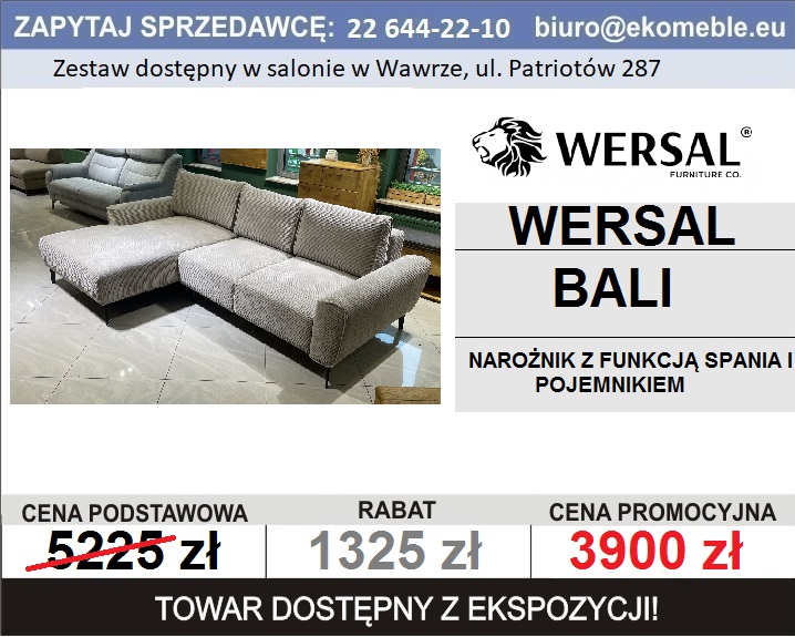 Najnowszy katalog mebli Wersal dostępny jest w salonach stacjonarnych Ekomeble, wersję PDF wysyłamy na życzenie drogą mailową, skontaktuj się z nami: + 48 22 644-22-10 , biuro@ekomeble.eu